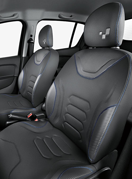 No interior, os bancos tem tecnologia CCT (Cover Carving Technology – apresenta espumas mais espessas, entre 5 mm e 20 mm, com formato que “abraça” o corpo) e cor preta, revestimento específico que lembram a fibra de carbono e bordado com a identidade visual da Renault Sport no apoio de cabeça; volante revestido em couro com a inscrição GT Line. Os detalhes na cor azul estão presentes nas costuras do banco, volante e manopla do câmbio, além dos aros da saída de ar e do velocímetro.