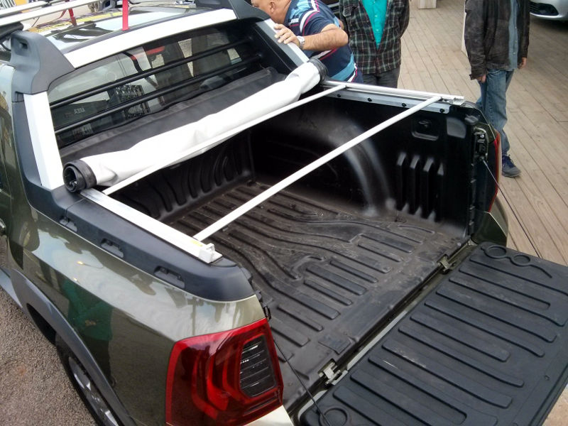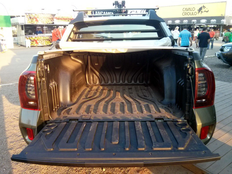 A caçamba do Duster Oroch não é tão grande quanto eu imaginei, sendo semelhante á da Strada Cabine Estendida (Trekking e Adventure). São 683 litros de volume e até 650 kg de capacidade carga. Bom que a Renault irá lançar um alongador, que ampliará o volume em 300 litros (983 l ao todo) e permitirá que um objeto (uma moto, por exemplo) de até 2 metros de comprimento seja levado na caçamba (em diagonal).